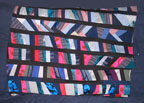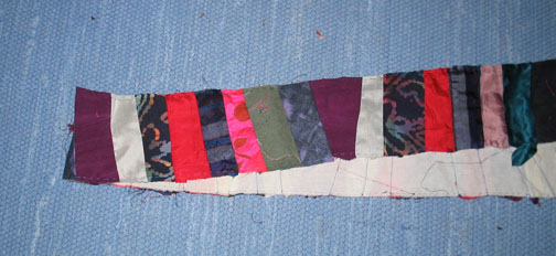 The latest method: Stripping! No, I'm not pole dancing, just emptying my box of silk scraps. First, I cut lengths of muslin (of which I have a lot of scraps from FIT classes), then stitch the smaller pieces of silk and cotton on top. Each strip is then bordered with a solid cotton twill, until it's large enough for the bed. This one will have no batting - the weight of the muslin will be enough, and I can always layer it with other quilts. I'm finding the smaller pieces are a lot easier to carry on the bus to work on. Again, you can click on the thumbnail for a larger view, and just hit the Back button to return.